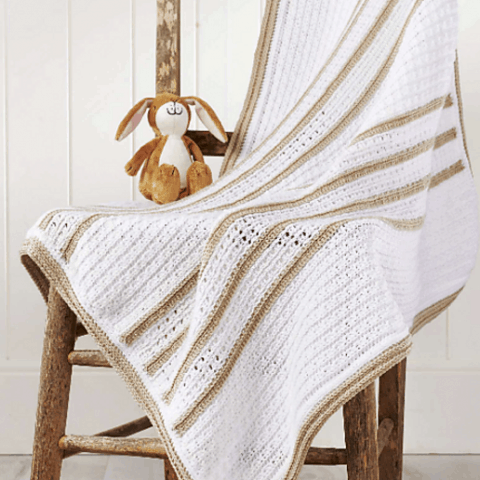 For a project that’s destined to become a handmade heirloom, classic, calming shades are the order of the day. Subtle stripes and a touch of texture make this sweet and simple blanket a pleasure to crochet.