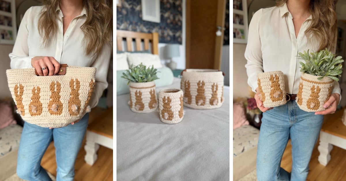 Featuring sweet bunny silhouettes with fluffy little tails, these baskets are both practical and decorative. Whether you’re looking for a crochet Easter basket pattern, a crochet bunny plant pot cover, or a fun seasonal storage solution, these baskets bring texture, character, and handmade charm to any space.