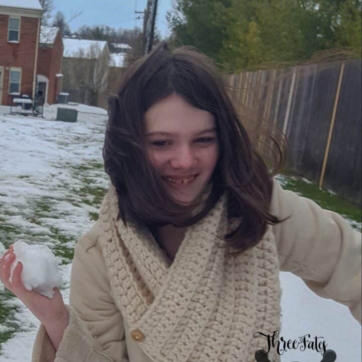 A warm and cosy bulky crochet cowl by Three Fates Creation.