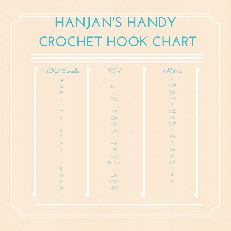 A simple little gift from HanJan today – a crochet hook conversion chart! No matter how many times I use my hooks I still have to search for and read up on which size means what and where!! To save you the trouble of constantly searching I’ve popped them all into a chart for you so that you can save it somewhere and know exactly where to look next time….beats trying to memorise it or just guessing…which obviously I would never do…….!