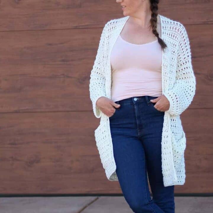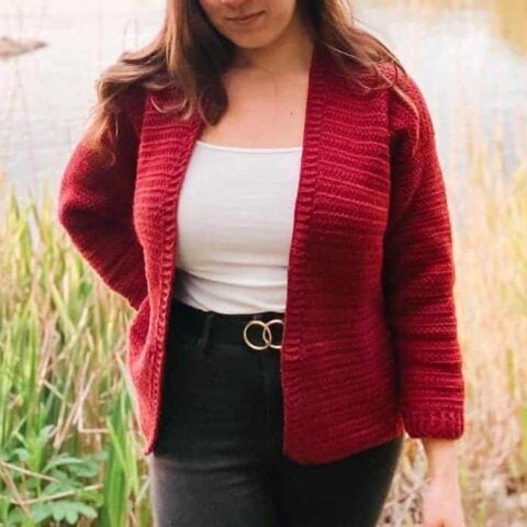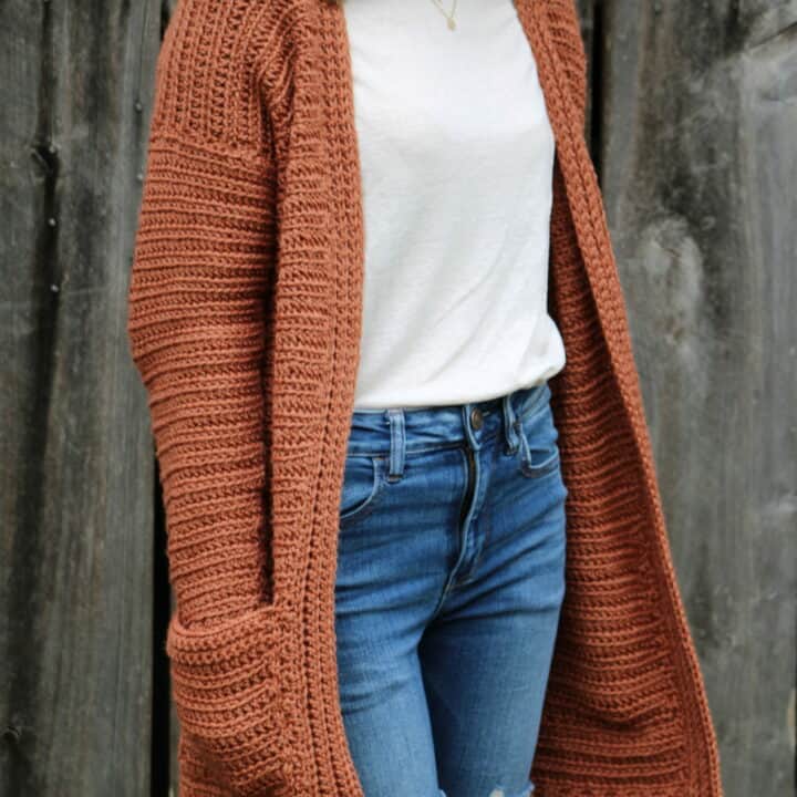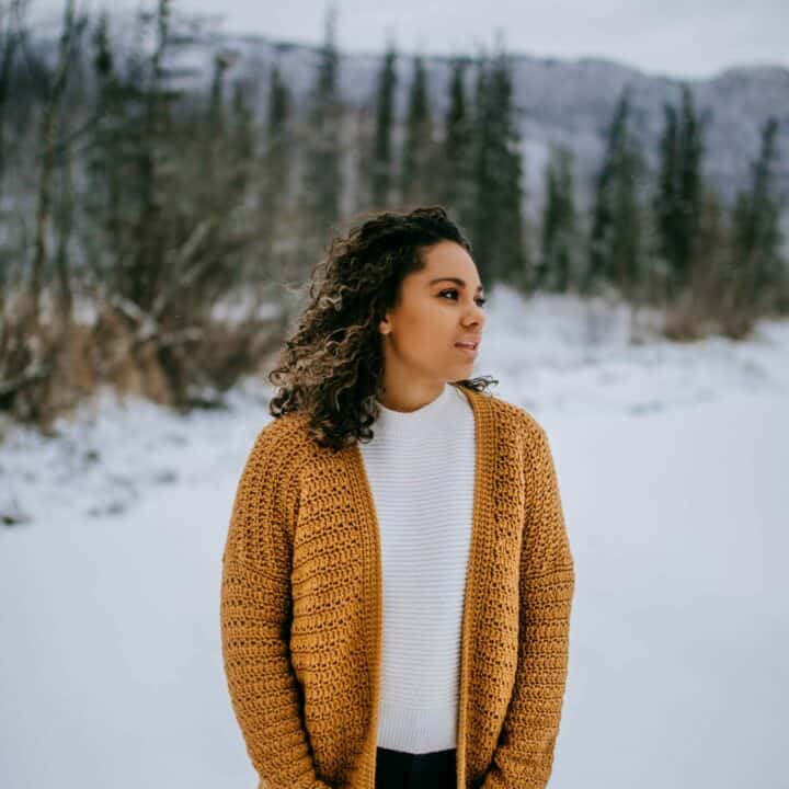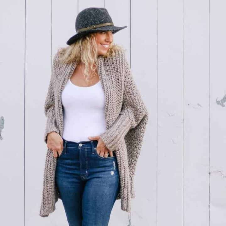 The Hometown chunky cardigan crochet pattern is an easy oversized sweater that you can throw over anything. You’ll stay warm and stylish in this oversized sweater, perfect for laying in colder months.