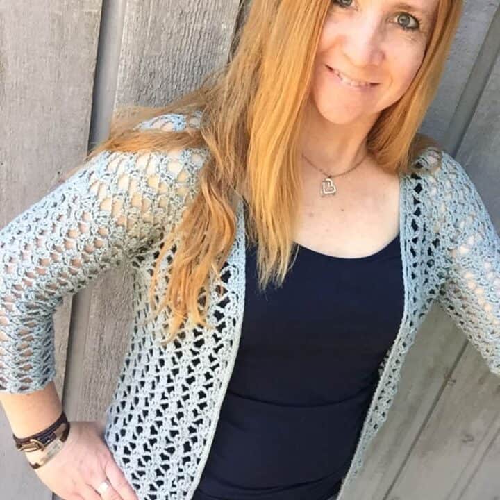 The most important thing when choosing yarn is to make sure that you work a gauge swatch. The pattern will tell you how many stitches and rows you need to get in a 4″ square so that the cardigan you crochet will be the size intended in the pattern.