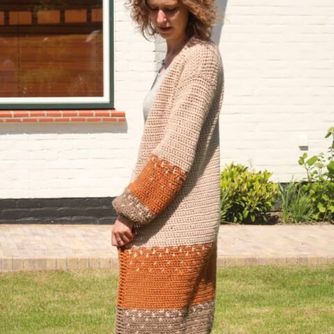 A cosy long crochet cardigan pattern perfect to double up as a coat! With pockets and a detailed rib to make it modern and yet classic.