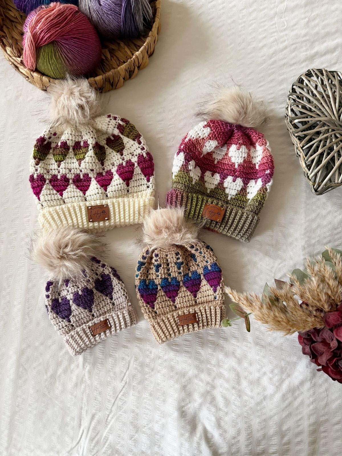 Pattern for: a crochet heart beanie in 6 different sizes for adults and children