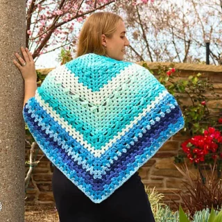 With this triangle shawl pattern, you'll be adding the classic granny crochet technique to your wearable project. A unique twist is added by crossing over the clusters in some of the rows and that can also help you distinguish between different colors if you're using solid yarn.