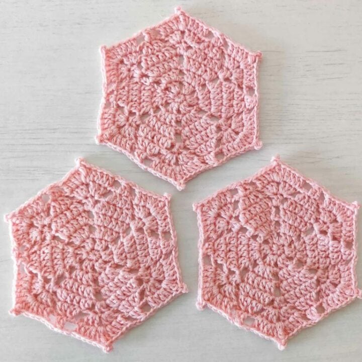 This roundup features all sorts of hexagon crochet patterns, from super quick coasters that you can whip up in an evening, to larger blanket and cardigan projects. Most use a combination of simple stitches that are suitable for beginner to intermediate level.