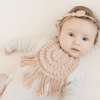 The Bitty Boho Bib is a fun and trendy design. The fringe trim and the texture created by the bobble stitch give it an adorable baby bohemian flare. The Bitty Boho Bib adds style to baby’s outfit while being practical and functional at the same time.