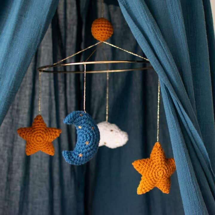 A dreamy and classy crochet mobile with delicate strands of golden angel hair and sparkling stars sequins. Let’s get started for some baby room cocooning decor!