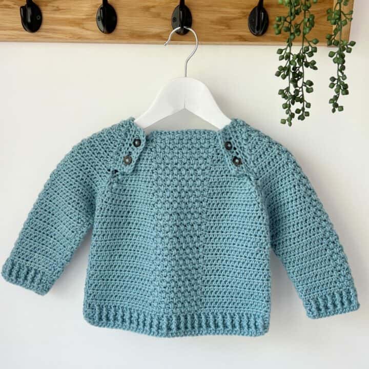 Keep your little ones cosy in this simple button up raglan sweater. Using a combination of beginner stitches to create a simple body and a central textured panel, this is a quick and easy baby crochet sweater pattern to make.